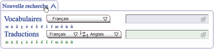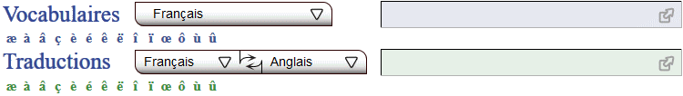 Mode Texte double qui permet la comparaison entre deux requêtes. C’est le mode privilégié pour la traduction car il permet d’interroger à la fois le dictionnaire d'une langue vers une autre et inversement. Il permet également une comparaison simultanée des résultats de deux requêtes qu’elles soient en Traductions ou pour une seule langue en Vocabulaires.