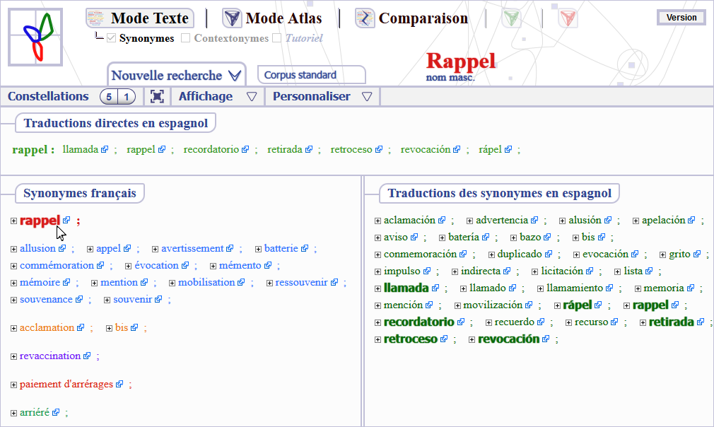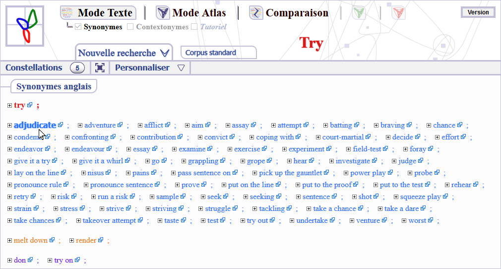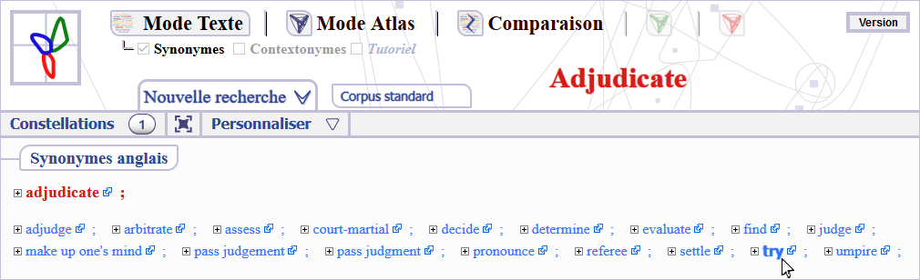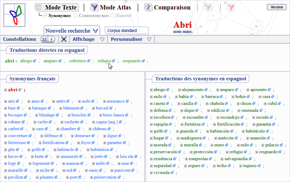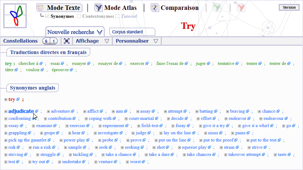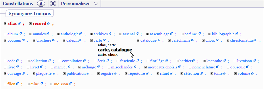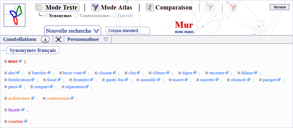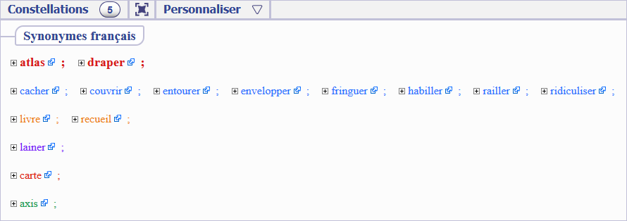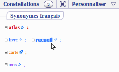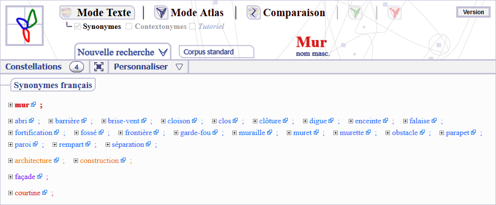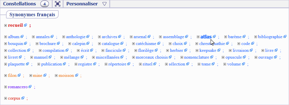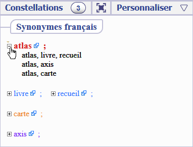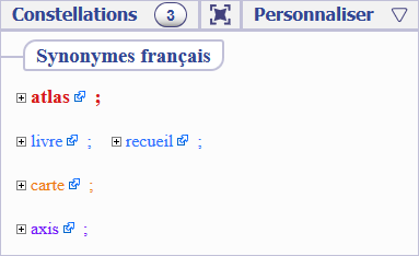 Mode Atlas sous une forme textuelle. Sa lecture est plus habituelle. Il présente les synonymes en ensembles distincts de sens plus ou moins fins (constellations) ou encore les traductions des synonymes.