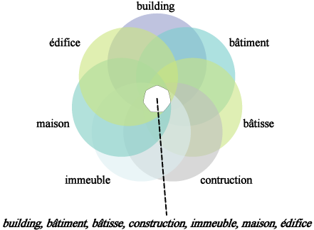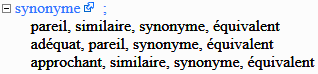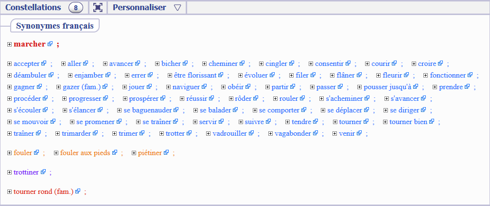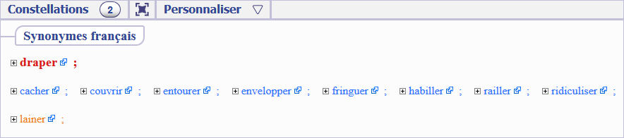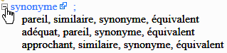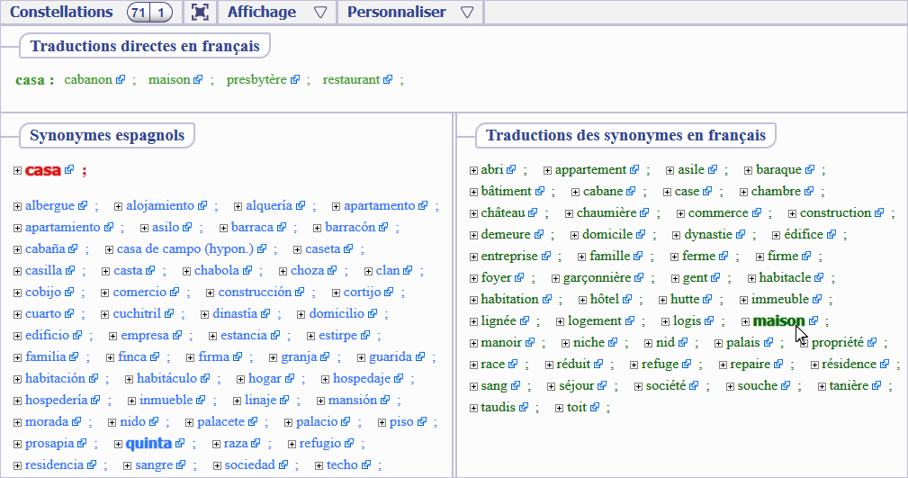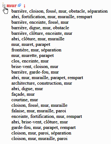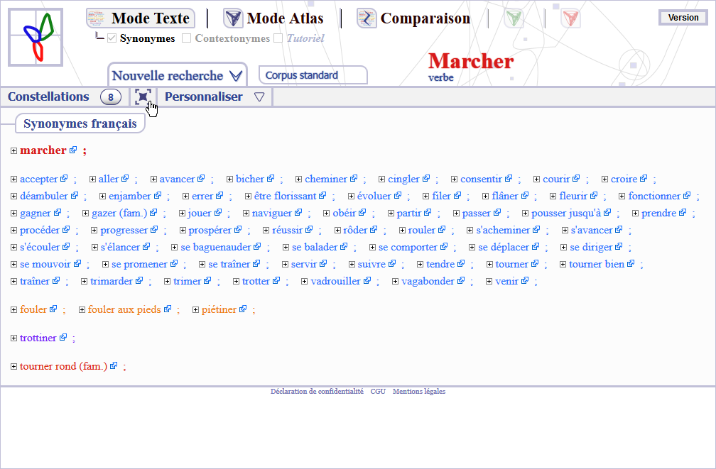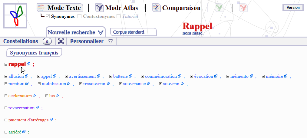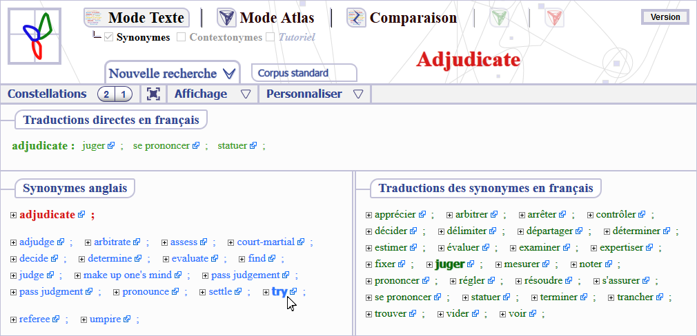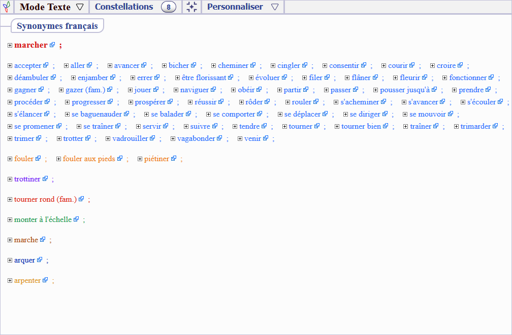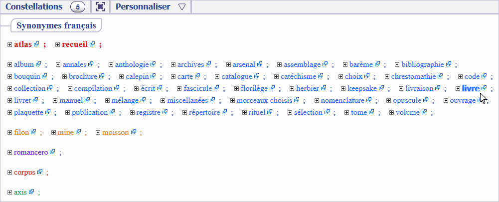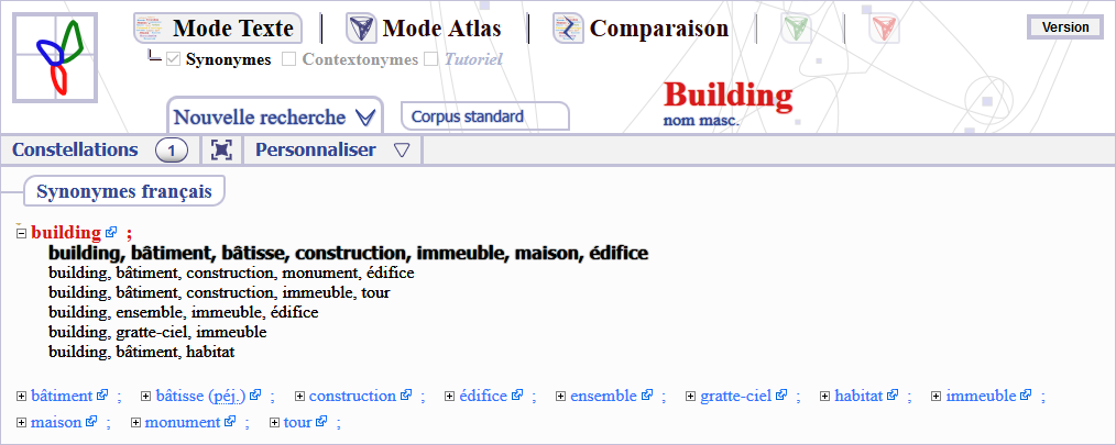 Mode Atlas sous une forme textuelle. Sa lecture est plus habituelle. Il présente les synonymes en ensembles distincts de sens plus ou moins fins (constellations) ou encore les traductions des synonymes.