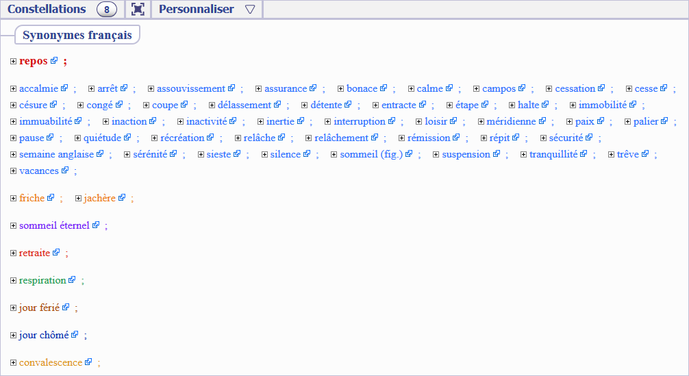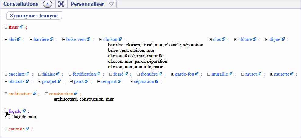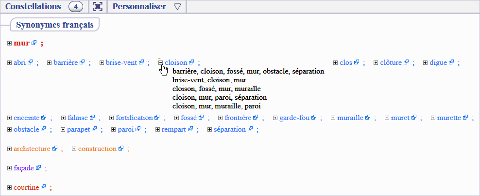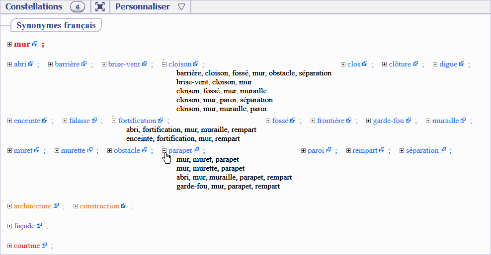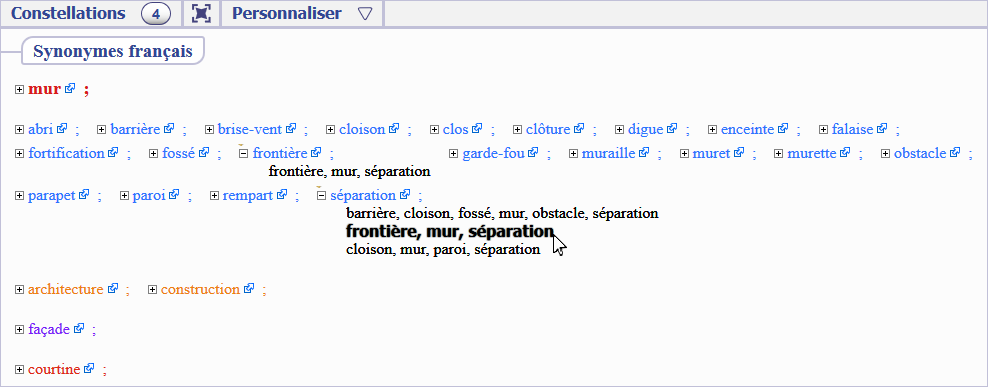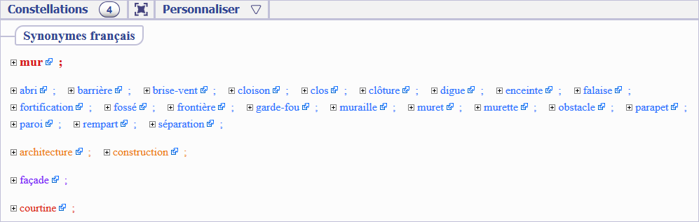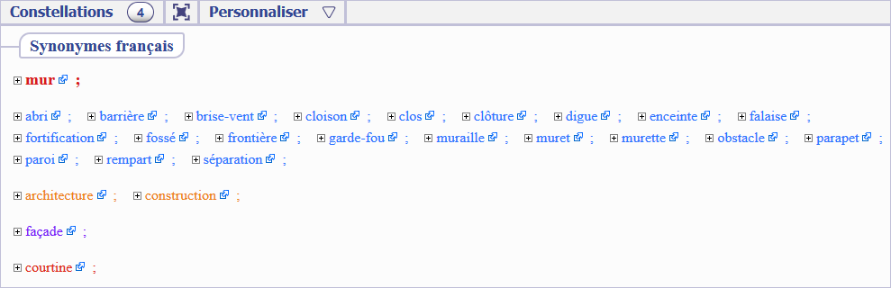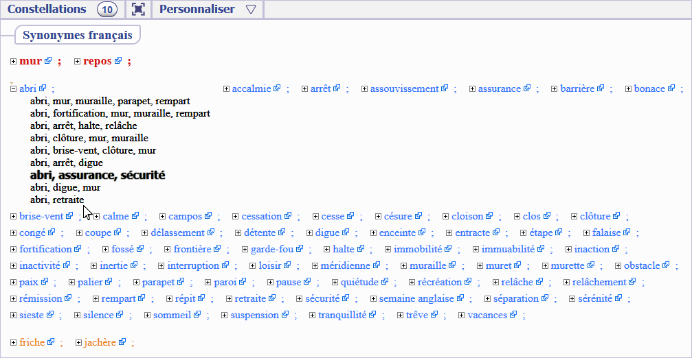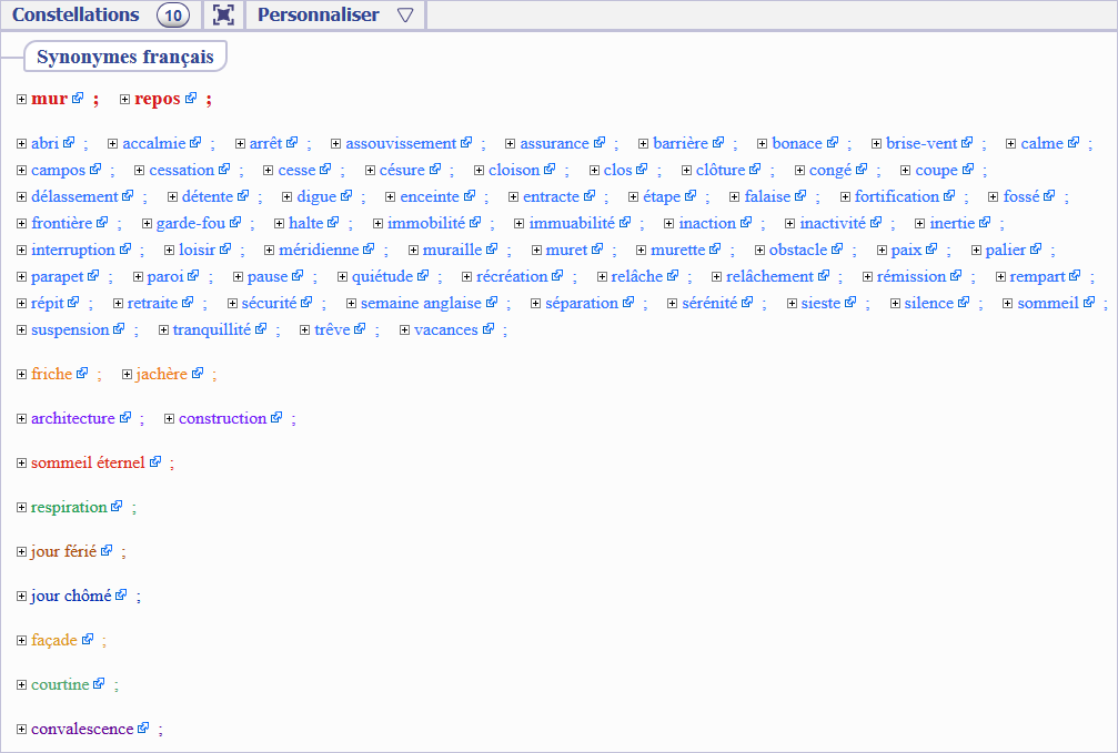 Mode Texte de la requête multiple en Vocabulaires des termes français « mur » et « repos », on constate que des constellations propres à chacun des termes ont fusionné pour construire la première constellation de synonymes de la requête multiple. Pourtant, l'un et l'autre n'ont aucun synonyme en commun.