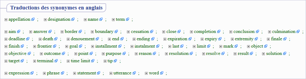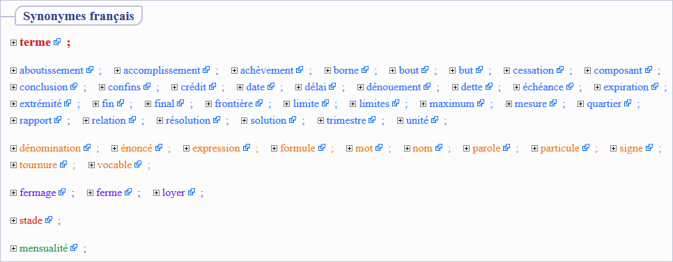 Mode Texte de la requête en Traductions du mot français « terme » vers l'anglais. Elles sont organisées en 3 constellations :