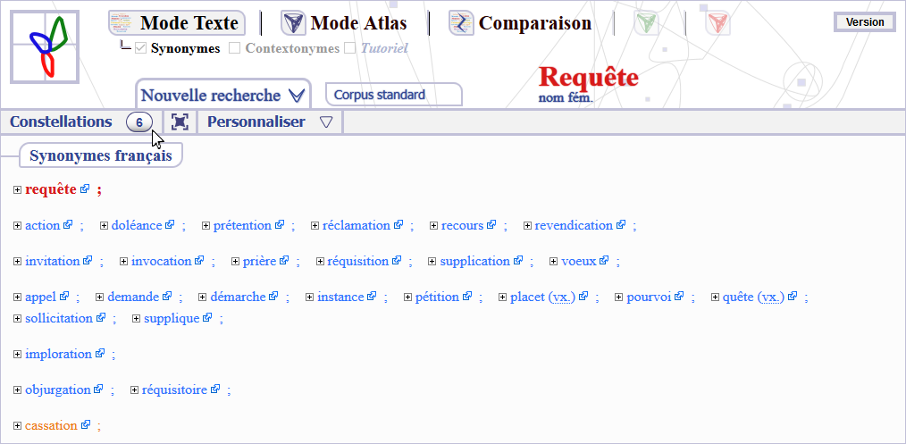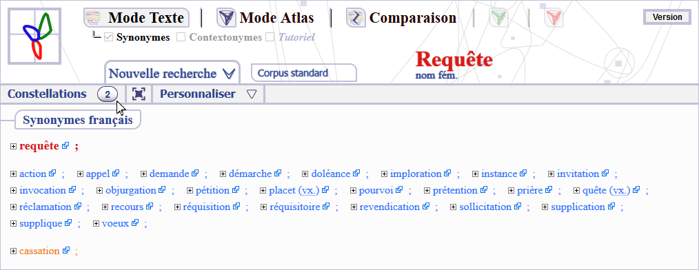 Mode Texte de la requête en Vocabulaires du mot français « requête » propose d'organiser les synonymes en 2 constellations par défaut :