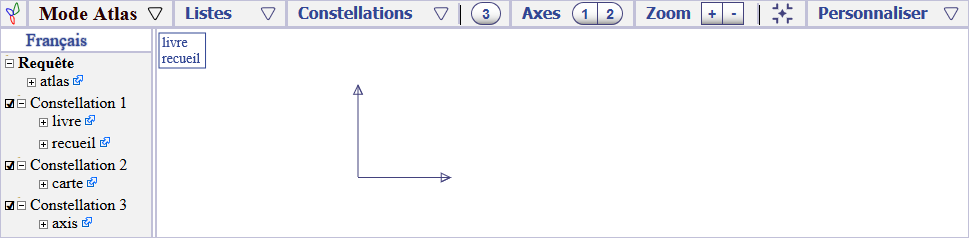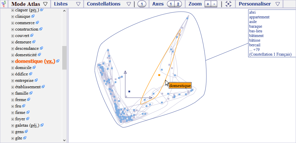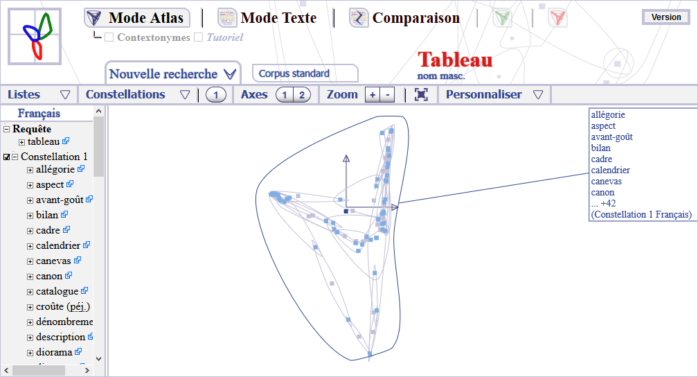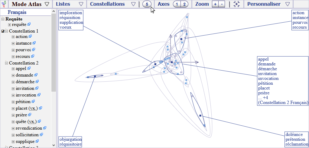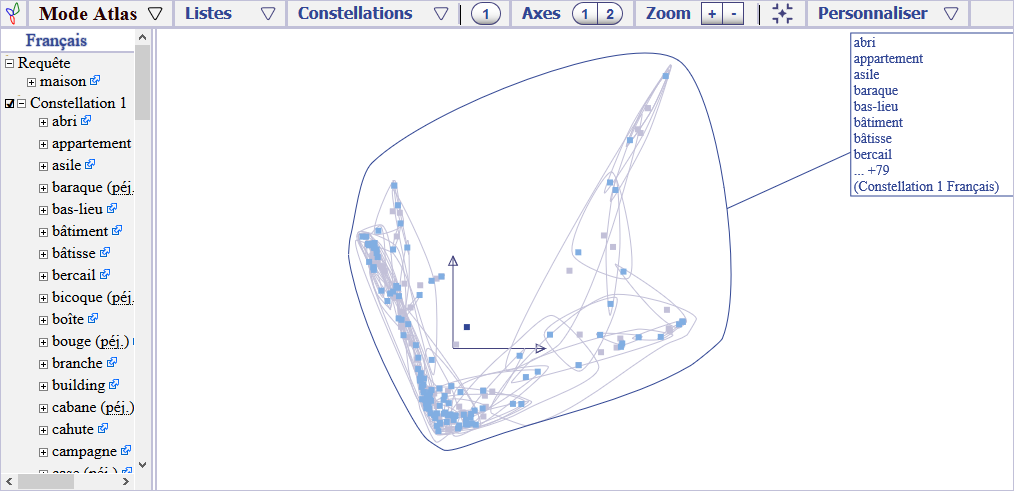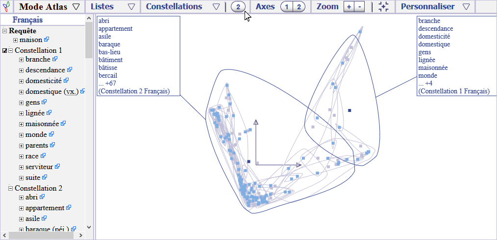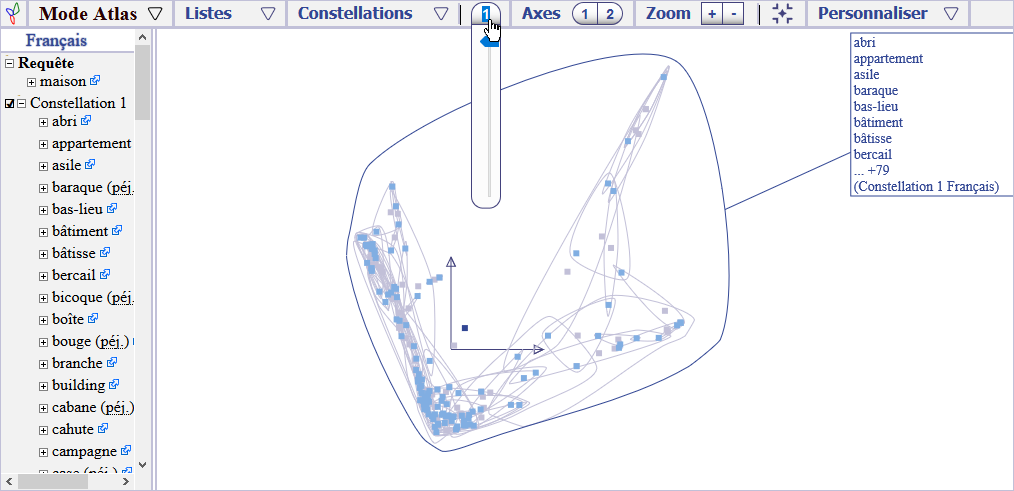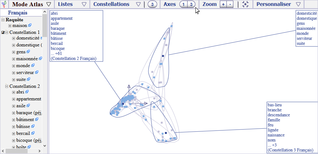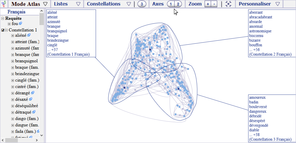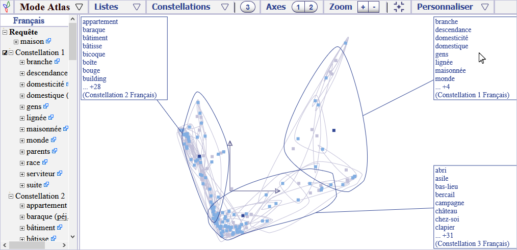 Mode Atlas. Une fois les cartes établies, les constellations permettent de regrouper les différentes valeurs sémantiques d’un mot avec une granularité qui peut être choisie par l’utilisateur.le terme d'une requête est une carte géographique (la projection d'un espace multidimensionnel à un espace à deux dimensions), les cliques sont les lieux composant la carte, les constellations sont des territoires de la carte (des régions, ou si on cherche une division plus fine : des départements, des territoires communaux,...).