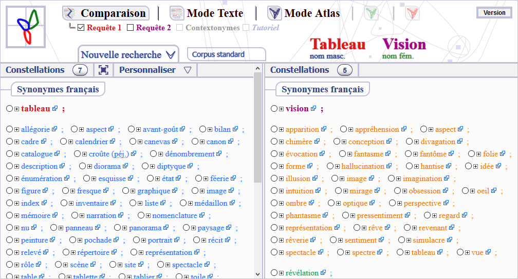 Mode Comparaison de la requête en Vocabulaires des termes français « tableau » et « vision » obtenus à partir du terme « tableau » :