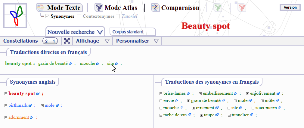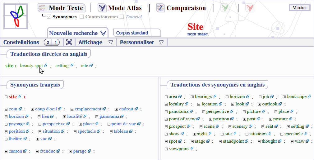 Mode Texte. La langue d'interface sera conservée. Les traductions directes seront donc en français et le mot « site » en fera partie. De plus, les synonymes de « beauty spot » seront en anglais et les traductions de synonymes en français.
