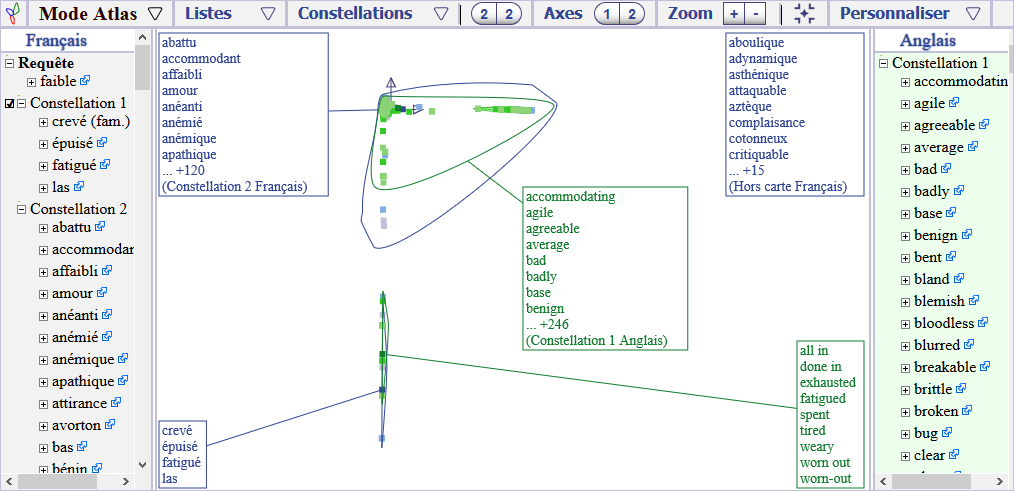 Mode Atlas est le mode constitutif des Atlas sémantiques. Il permet de visualiser des cartes sémantiques qui donnent les proximités et recouvrements de sens entre termes, des distinctions de sens plus ou moins fines (constellations) et l’appariement des valeurs sémantiques entre deux langues.
