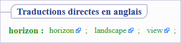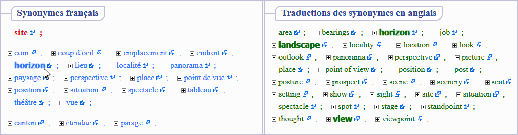 Mode Texte du mot français « site » en Traductions vers l'anglais, le terme « horizon » est un synonyme. En cliquant sur ce synonyme, il sera mis en valeur ainsi que ses traductions directes en anglais : « horizon », « landscape » et « view » présentes parmi les traductions de synonymes de la requête :