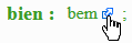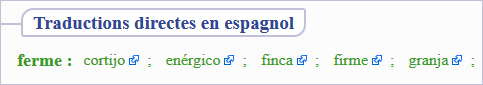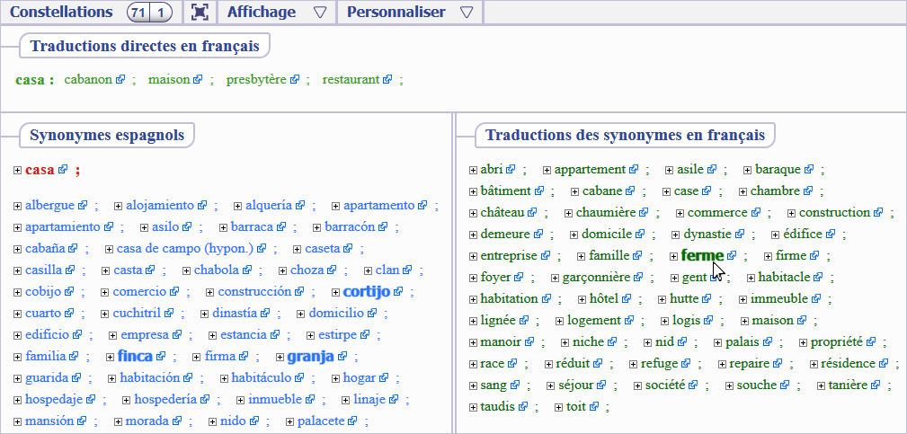 Mode Texte du mot espagnol « casa » en Traductions vers le français, le terme « ferme » apparaît dans les traductions de synonymes mais pas dans les traductions directes. En cliquant sur ce terme, il sera mis en valeur ainsi que les synonymes espagnols de la requête dont il est la traduction : « cortijo », « finca » et « granja » :